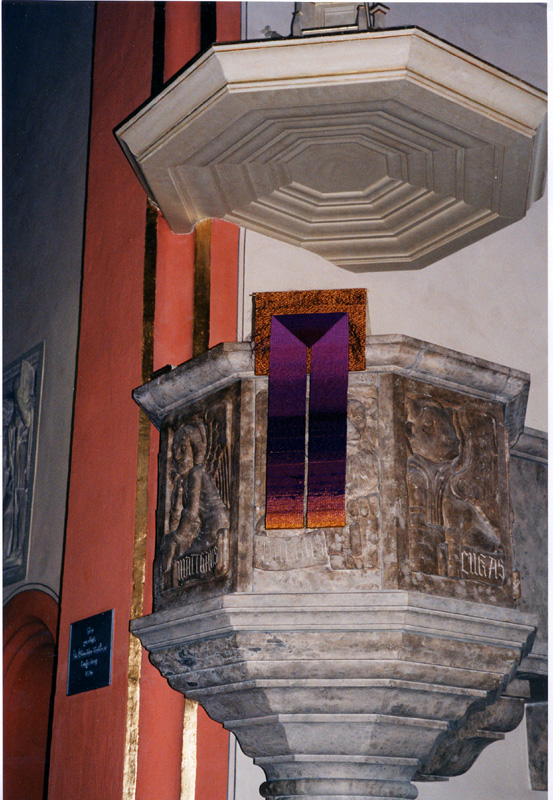 Während der letzten 30 Jahre habe ich eine Vielzahl von Antependien für die unterschiedlichsten Kirchen entworfen und angefertigt. Jedes ist ein Einzelstück, für einen bestimmten Raum, dessen Architektur, Proportionen und Atmosphäre entworfen und gestaltet. Diese, von der Größe her eher kleine Kunstwerke fügen sich harmonisch ein und betonon Altar und Kanzel.