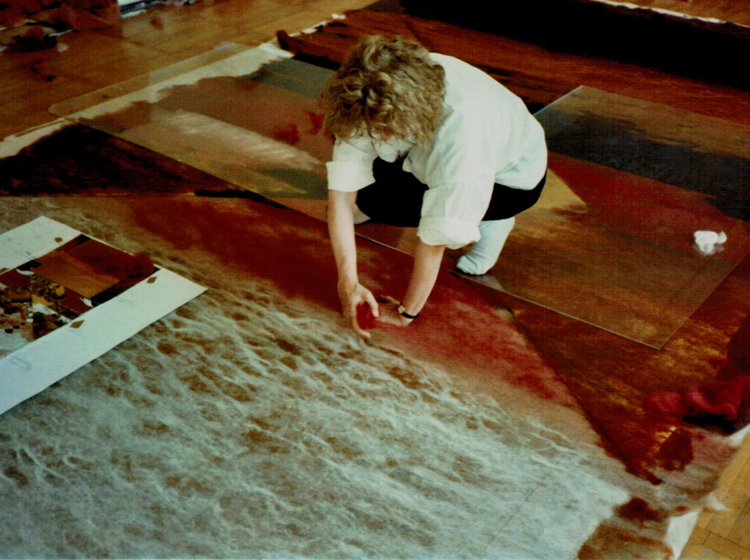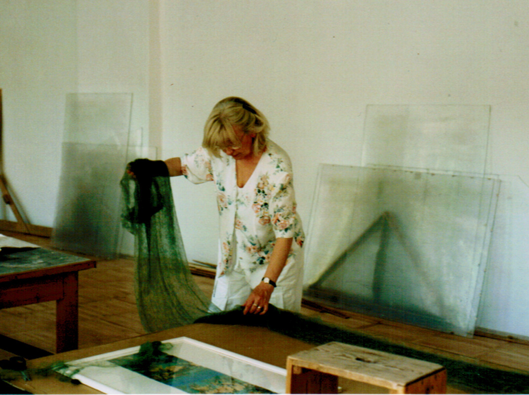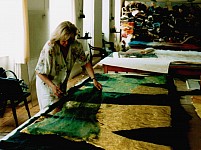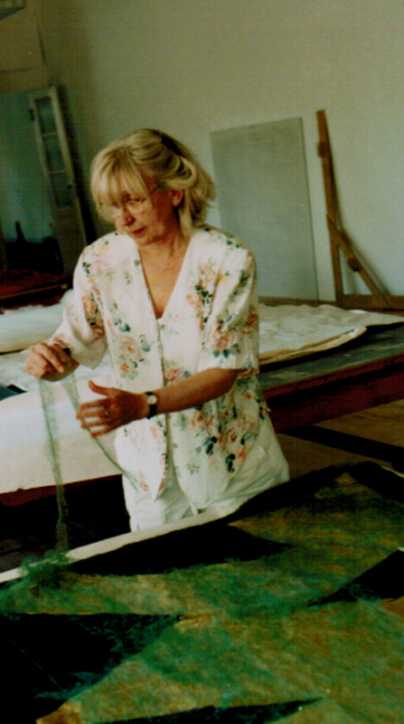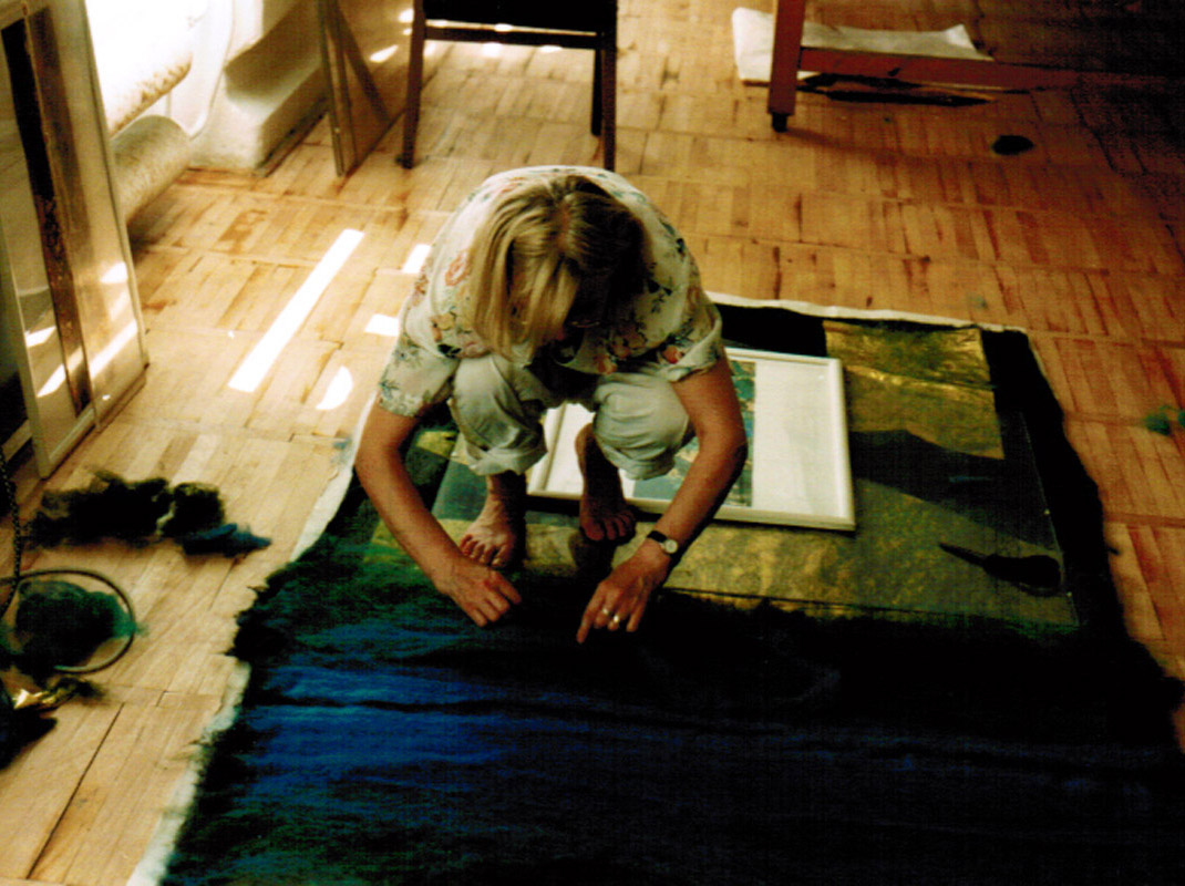 Die von mir aus verschiedenen Textilelementen, Folien und Wollflies gestalteten Bilder wurden mit einer im Wollforschungsinstitut Brünn entwickelten und patentierte Maschine auf eine feste Textilunterlage mit unsichtbaren Nähten dicht angenäht und auf diese Weise fixiert.