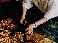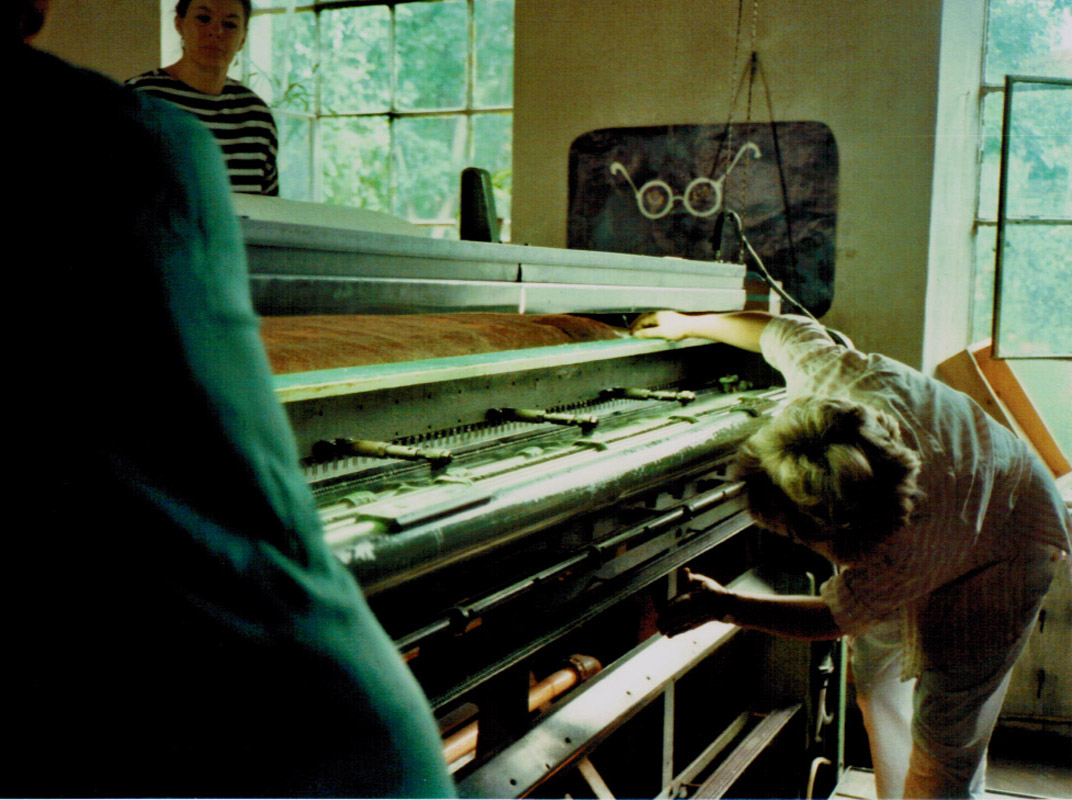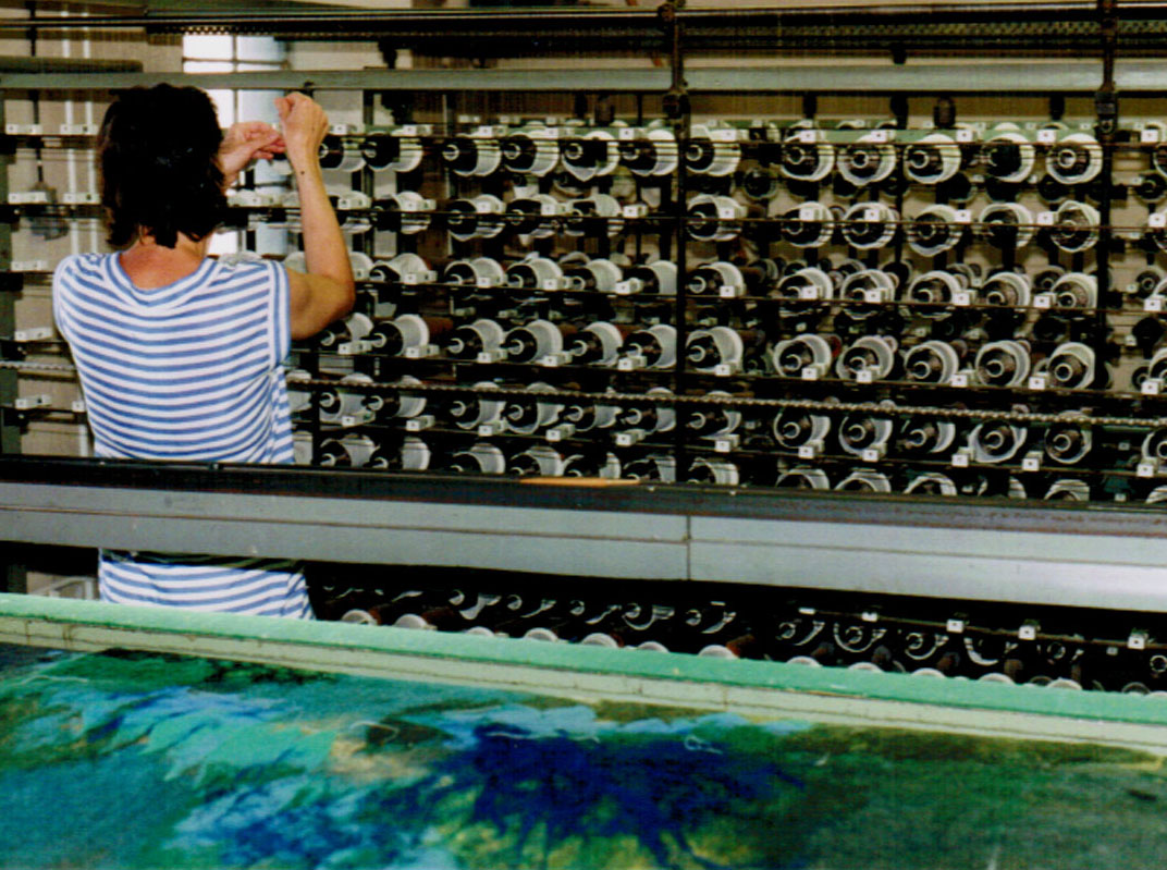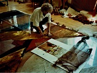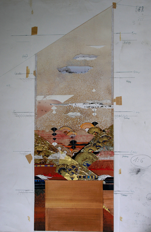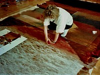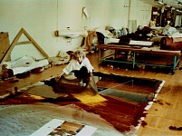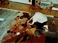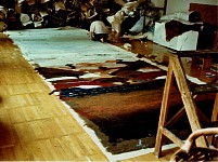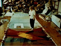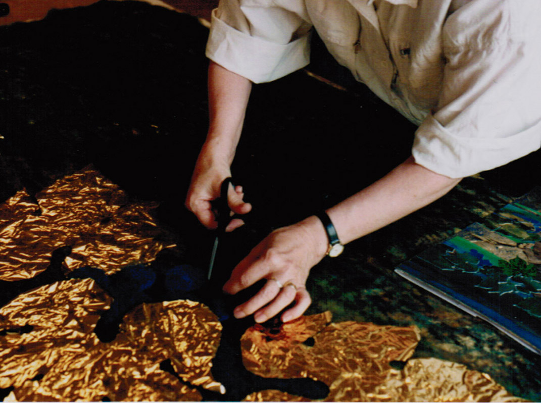 Die von mir aus verschiedenen Textilelementen, Folien und Wollflies gestalteten Bilder wurden mit einer im Wollforschungsinstitut Brünn entwickelten und patentierte Maschine auf eine feste Textilunterlage mit unsichtbaren Nähten dicht angenäht und auf diese Weise fixiert.